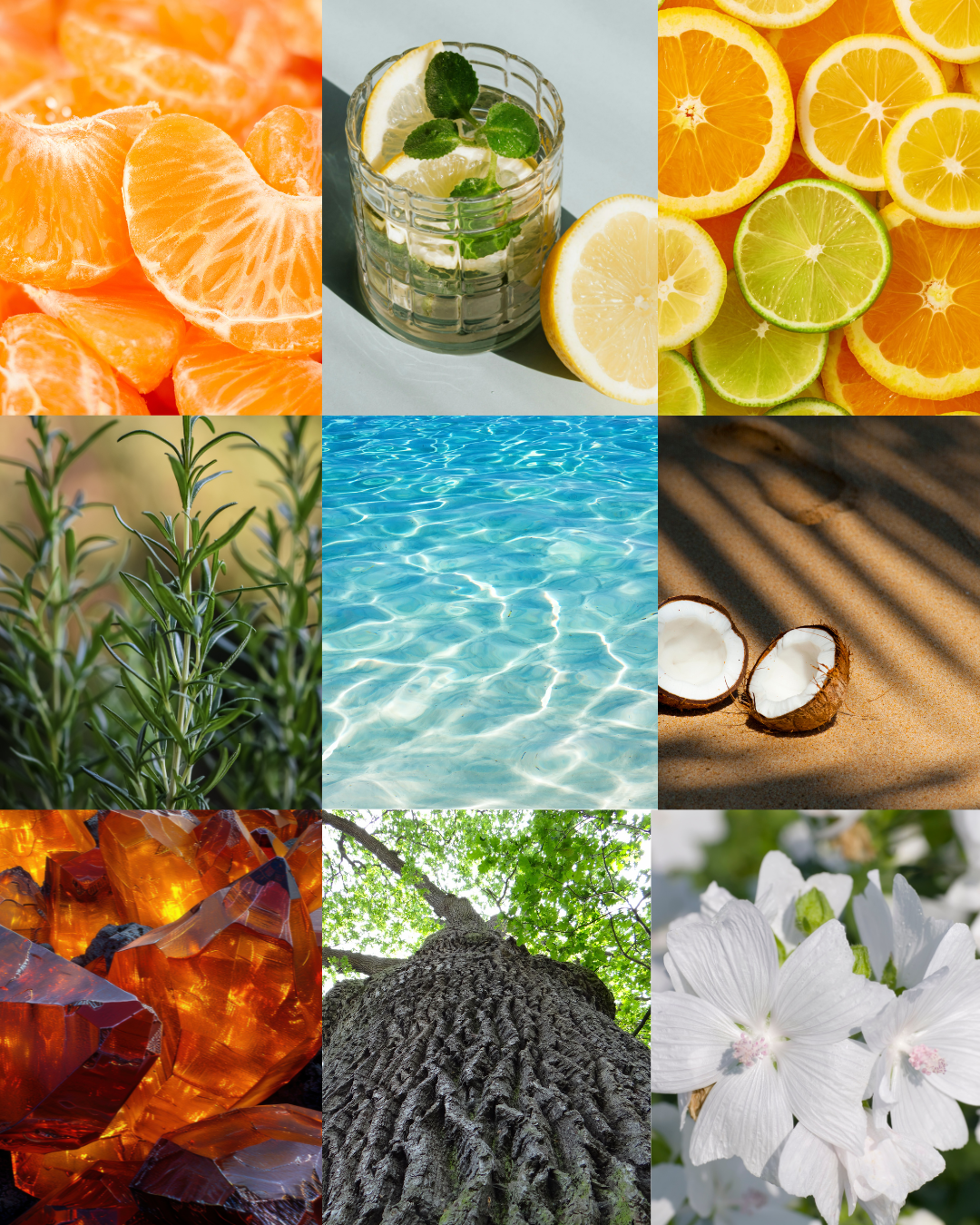 🌊 Notas marinas · 🍊 Mandarina · 🥥 Coco · 🍊 Naranja · 🍋 Lima (limón verde) · 🍋 Cidra